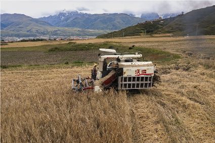 每年9月初,都是甘孜縣青稞收獲的季節(jié)。今年的秋收季已經開始,甘孜縣甘孜鎮(zhèn)斯俄片區(qū)的村民正忙著收割青稞。如今的雪域高原,農業(yè)生產已經基本告別人力耕作時代,實現了機械化耕作。今年甘孜縣的青稞長勢良好,有望成為又一個豐收年。