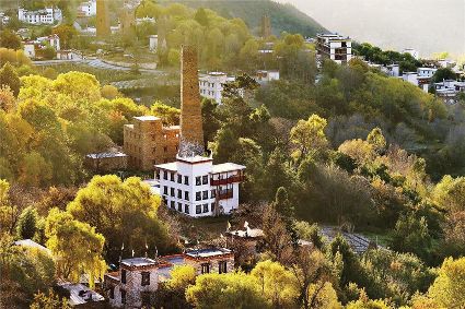 甲居藏寨依山面水,紅白相間的民居從大金河谷層層疊疊向上攀援,錯落有致的散布在山坡上,樹葉漸次褪綠,漸染紅色,山頂是皚皚白雪,將田園牧歌式的畫卷展示在人們眼前。