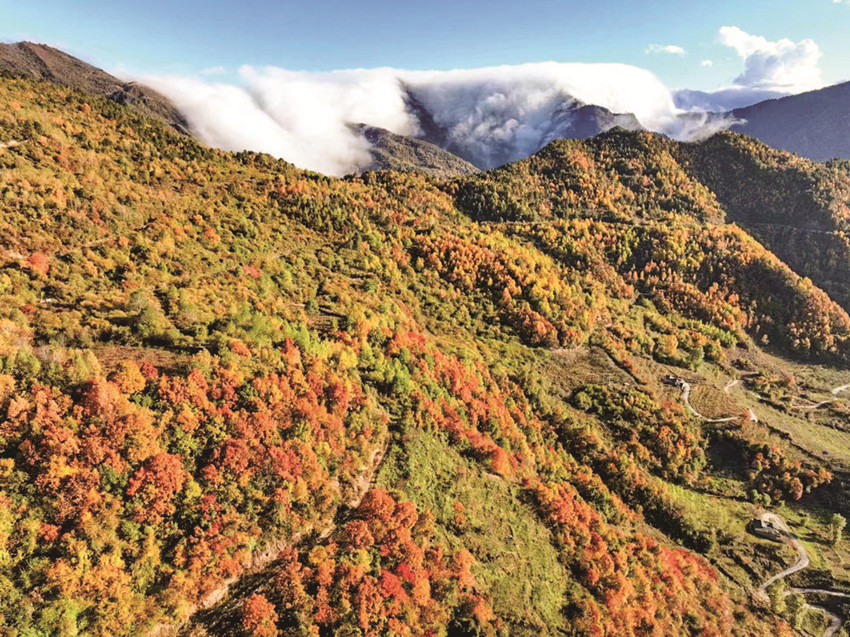 冷風(fēng)肅起,大雁南飛,銀杏樹開始了一年中最華麗的篇章,風(fēng)兒吹過,銀杏樹葉紛紛揚揚地,從樹上飄落下來,宛如無數(shù)只金色的蝴蝶,在空中漫天飛舞?!八厣鷿狻保瑵M山層林盡染,演繹著另一番亮麗。多種色彩交織在一起,如同一幅流動的美麗畫卷,使得這個季節(jié)更有韻味。