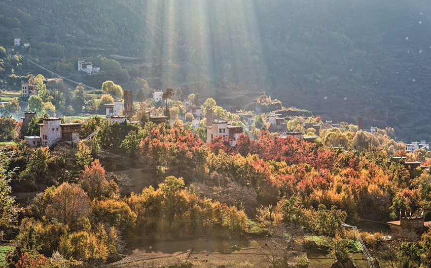 四季更迭,中路藏寨的魅力各異。秋天,正是藏寨最為絢爛的季節(jié)。造型獨(dú)特、別致的藏式民居,蜿蜒曲折的林間小道,組成了一幅美不勝收的畫卷。藏寨依山勢(shì)迤邐連綿,分布在相對(duì)高差近千米的山坡上,藏式樓房灑落在五彩斑斕的彩林中,與山谷、溪流、雪峰交相輝映,極富層次,構(gòu)成了一幅恬靜如詩的優(yōu)美畫卷。