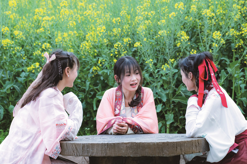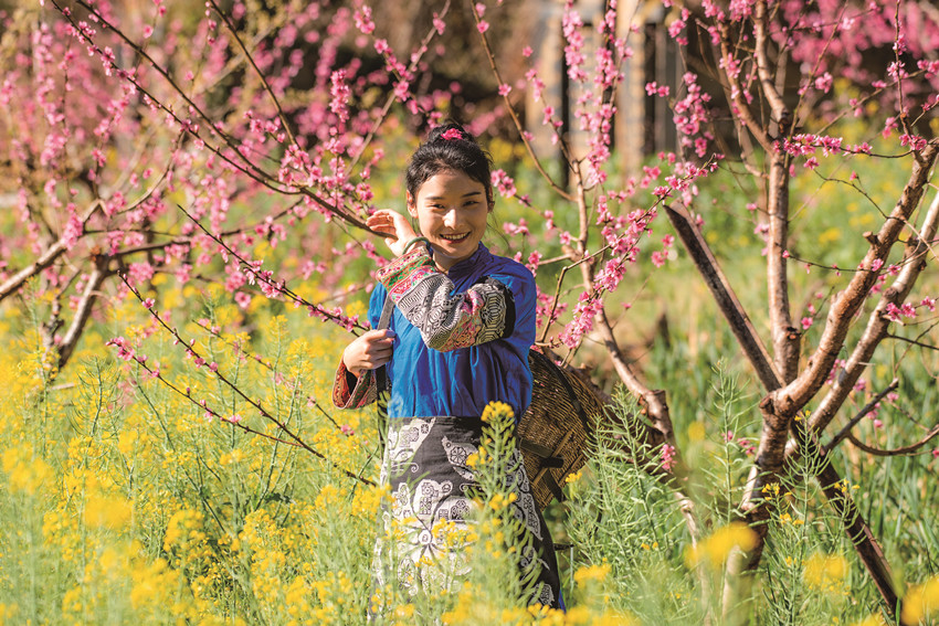 陽春三月,驅(qū)車百里,峰回路轉(zhuǎn),至一小鎮(zhèn),喚烏拉溪,為古驛站。背夫崖下,峻山環(huán)護(hù),小河繞村,屋舍散落,白墻灰瓦,綴以紅檐,桃花夭夭,棧道蜿蜒??图倚∨?,青衣嬌容,穿行花間,簪花比俏。昔日荒坡,綠樹成蔭,繁花之下,草莓豆莢,青果胡豆,蔓草芳苓。