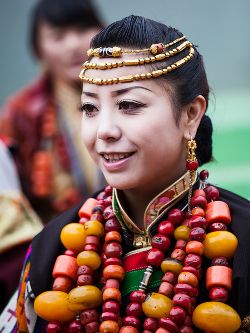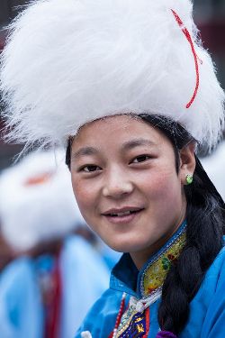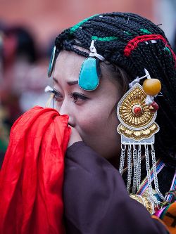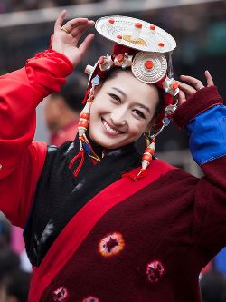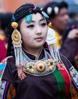 藏裝的基本特點(diǎn)是長(zhǎng)袖、寬腰、大襟、肥大。直線寬邊,色彩對(duì)比強(qiáng)烈。男女藏袍均習(xí)慣以粗紡厚毛呢為料,左襟大,右襟小,一般在右腋下釘一個(gè)紐扣,或是用紅、藍(lán)、綠、雪青等色布做兩條飄帶,穿時(shí)結(jié)上。男式藏袍多為黑、白兩色,領(lǐng)圍、袖口、衣襟和底邊,鑲上色布或綢子底邊,古樸渾厚。夏天或勞動(dòng)時(shí),一般只穿左袖,右袖從后面拉到胸前搭在左肩上,也可左右袖均不穿,兩袖束在腰間,古銅色的皮膚袒露于外,雄風(fēng)凜凜,彪悍剛健。女式藏袍,分有袖和無袖的兩種,夏秋兩季的藏袍無袖。里面多襯有紅、綠等色彩鮮艷的襯衣,襯衣翻領(lǐng)在外,衣袖要長(zhǎng)于胳膊一至二倍,長(zhǎng)出部分,平時(shí)卷起,舞蹈時(shí)放下,舒展飄逸,瀟灑自如。藏族的帽子式樣繁多,各地均有不同,拉薩等地以金寶頂帽為最多,用金絲或銀絲繡織圖案,在陽光照耀下,閃閃發(fā)光。金花帽是男女老幼都喜歡戴的民族帽。男女穿的藏靴,底高二寸,靴腰高至小腿以上,靴面用紅綠相間的毛呢裝飾,繡有圖案花紋。靴頭向上隆起。藏族男女喜歡佩飾。耳穿大環(huán),手腕金銀,頂戴珠鏈,尤其是在腰間,男挎長(zhǎng)劍,女佩腰刀,更顯得粗獷彪美。