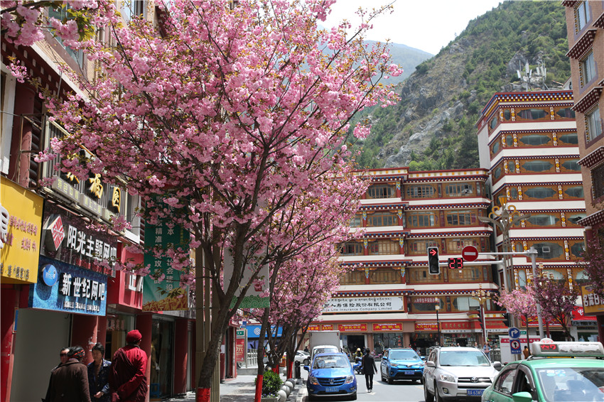 當春天遇見最美的櫻花時,驚艷了整個康定。櫻花與身邊人都將成為春日里的浪漫風景。櫻花之美,美在氣勢,櫻花紛飛,夢幻唯美。每年4月中旬,康定城北門的櫻花綻放后,人們像是約好了一樣聚集到這里,共赴這一場甜美盛宴。這一路繁花似錦,人們穿過枝椏花正盛的櫻花林,穿過粉色海洋,徑直奔向一個浪漫的童話,一路櫻花飄散,一路粉光燦爛。櫻花絢麗繽紛、陸續(xù)綻放,若恰逢一陣春風經(jīng)過,櫻花瓣隨風舞動,猶如紛落的雪花,空氣中浮動著櫻花特有的淡淡香氣,令人不禁懷疑自己置身夢境?!翱刀ǖ拇禾靵淼靡硪恍`放的櫻花,滿街的花草,折多河畔楊柳依依,康定的春天無比驚艷,醉了游人?!敝芟壬贿吪恼?,一邊感嘆,他在康定生活了40多年,20年前的康定,可以說找不到像樣的花草樹木,進入新時代,康定城市變美了,城市綠化走在了前面,城市的美譽度舒適度不斷提升??刀ㄖ海荷珴M園,姹紫嫣紅,風光旖旎。