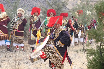 除了歌舞文化,德欽還是民俗文化最大的平臺(tái),神山祭祀是村村寨寨必不可少的活動(dòng),在德欽,藏民對(duì)山水自然賦予了靈性,認(rèn)為自然也是和人一樣有著生命和靈性,尊重自然演繹出神山祭祀活動(dòng)豐富多彩?!暗顿潯?藏語(yǔ)稱“百諧”。在德欽農(nóng)村,刀贊是祭祀活動(dòng)的重頭戲,這一天,不亞于一個(gè)盛大的服飾表演。相傳“百諧”是古時(shí)村民為消除戰(zhàn)亂,祈福平安的一項(xiàng)傳統(tǒng)祭祀活動(dòng),延續(xù)至今已經(jīng)成為一項(xiàng)傳統(tǒng)的民俗活動(dòng)?!鞍僦C”既是祭祀活動(dòng)的一個(gè)儀式,也是一個(gè)獨(dú)立的傳統(tǒng)民俗活動(dòng),村里每戶一男丁在這一天必須參加“百諧”?!疤K夏”是村里男人戴的最為隆重的帽子,他不同于金邊帽和狐皮帽。長(zhǎng)刀是“刀贊”的道具, “吉祥的日子里,我們一敬天地,賜給我們帶來(lái)幸福的生活;再敬尊敬的共產(chǎn)黨,為我們帶來(lái)平安吉祥;三敬慈祥的雙親,教會(huì)我們?nèi)绾巫鲆粋€(gè)好人……”朗朗上口的說(shuō)詞伴著閃閃的刀光起舞,頗具康巴壯士的英武陽(yáng)剛。