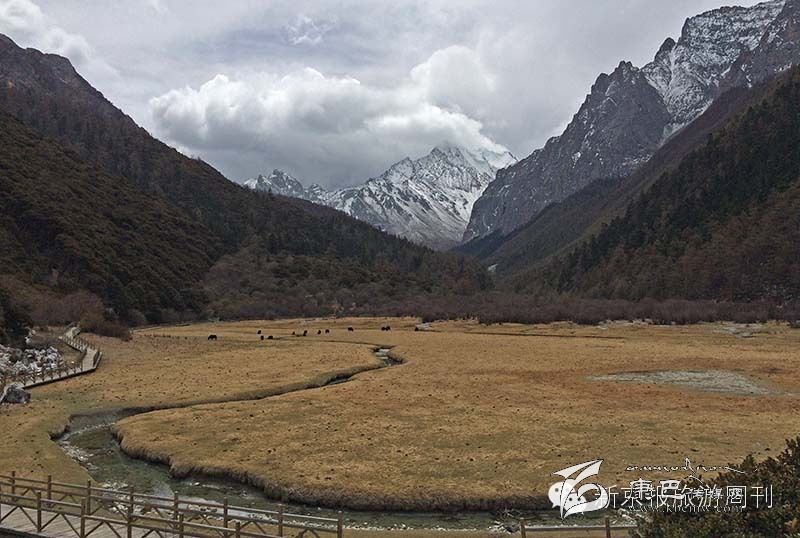 大概20分鐘左右的車程,我們到了洛絨牛場(chǎng)。這是一個(gè)被雪山環(huán)繞的草甸,仙乃日、央邁勇和夏郎多吉三座6000米的雪峰呈“品”字形分別位于西北、東南和東面,雪峰之間,形成了一片長(zhǎng)寬約5公里的高原寬谷。