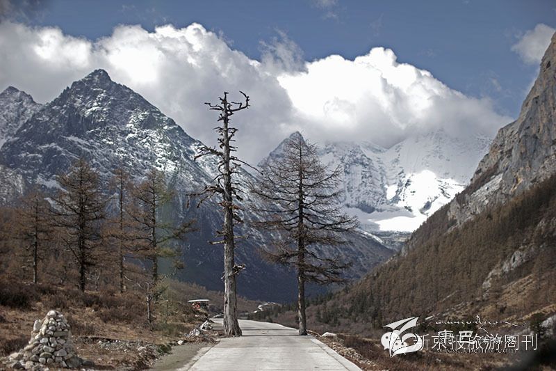 在海報4000多米的亞丁景區(qū),幾名當地居民背著重達百余斤物品走五公里往牛奶河居住地。通往洛絨牛場的山路。