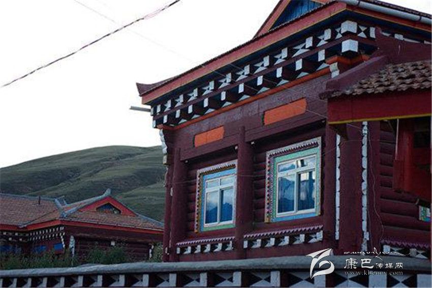 道孚民居的一般結(jié)構(gòu)是以藏式木架穿逗,作為整體骨架,一般為二、三層;以片石或泥土砌墻,按正方形各邊7-10尺為空間立柱,四柱之間稱一空,一般房屋有16-30空,也有40、50空的。柱與柱之間有穿枋或原木鎖拉扯,其余維護結(jié)構(gòu)由橫向平置,圓弧朝外的對剖圓木組成,它們層層重疊、四角交叉相搭,房頂高約5至8米。比起改進前,柱子直徑普遍加大,豪宅的柱子需兩人合圍,給人一種穩(wěn)重之感;底層和二層的木柱連體,并仿照內(nèi)地建筑的木穿逗式結(jié)構(gòu),梁柱接榫,形成一個牢固的整體,以增強抗震能力。外形多為四方形,二樓呈L形、凹形或回形,內(nèi)層結(jié)構(gòu)是純木材,架“棒柯”或“棒勒”,間隔為各種用途的房間。房間上裝木望板,下鋪木地板,頂蓋用樺樹皮或硬雜木條墊底再鋪“阿嘎土”,日曬雨淋絕不漏水。屋架門窗外表的裸露部分,則多以油漆或自制的有色土染過,既防腐防蛀,又美觀大方。從外部看,二層平臺的女兒墻上,種滿了各種花草,房前屋后還種植了果樹。用泥土夯筑的底層和二層后方的土墻刷成白色,而木質(zhì)的半圓木墻體涂成褐紅色,窗框和窗扇均作彩繪,室內(nèi)裝飾也都用紅色等“火熱”的基調(diào)。各種色彩相互協(xié)調(diào)映襯,給人的印象特別深刻。
