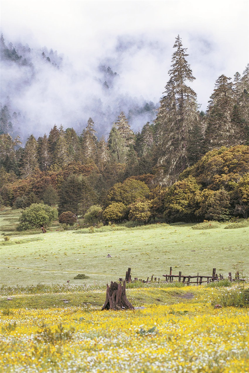 置身于雪山、湖色與草色,陽(yáng)光精確地照在一棵金色的樹上,樹的光亮奪目與遠(yuǎn)處云霧繚繞的暗山形成反差,如夢(mèng)如醉。