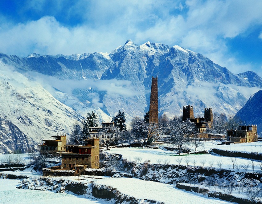 冬季的丹巴,山上銀裝素裹,山下田園蔥綠。藏寨和古碉依山而建,錯落有致,與自然合二為一。