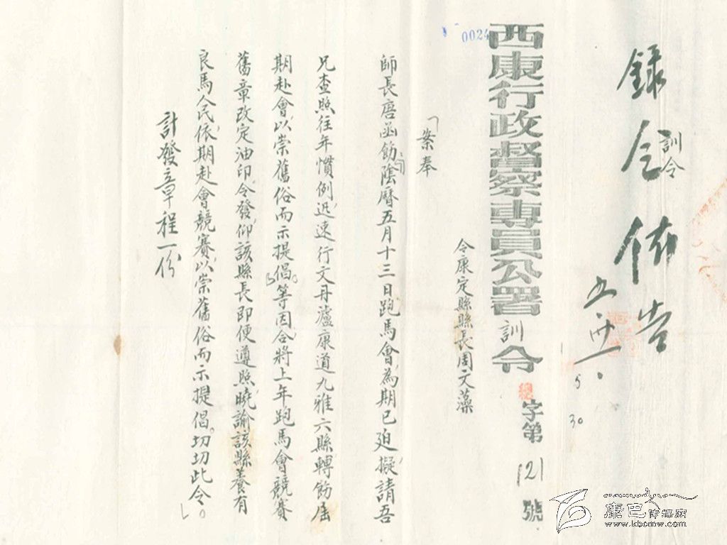 康定城各民族雜居,各種民族文化相融,形成了康定特有的民俗、風(fēng)俗。現(xiàn)在已經(jīng)不可能見到的“郭達(dá)將軍廟會(huì)”和每年“四月八轉(zhuǎn)山會(huì)”期間在康定城郊舉辦的“賽馬會(huì)”,這些屬于康定特有的民俗風(fēng)情,在民國(guó)時(shí)期曾經(jīng)盛況空前。舉辦“郭達(dá)將軍廟會(huì)”,警察要出來維持秩序。這份賽馬簡(jiǎn)章特指1940年“四月八轉(zhuǎn)山會(huì)”時(shí)的一次賽馬。據(jù)《甘孜州志》記載:在1940年的5月,由于有“康定、瀘定、九龍、丹巴、道孚、乾寧”騎手參加賽馬活動(dòng),才制定了這份“新簡(jiǎn)章”。