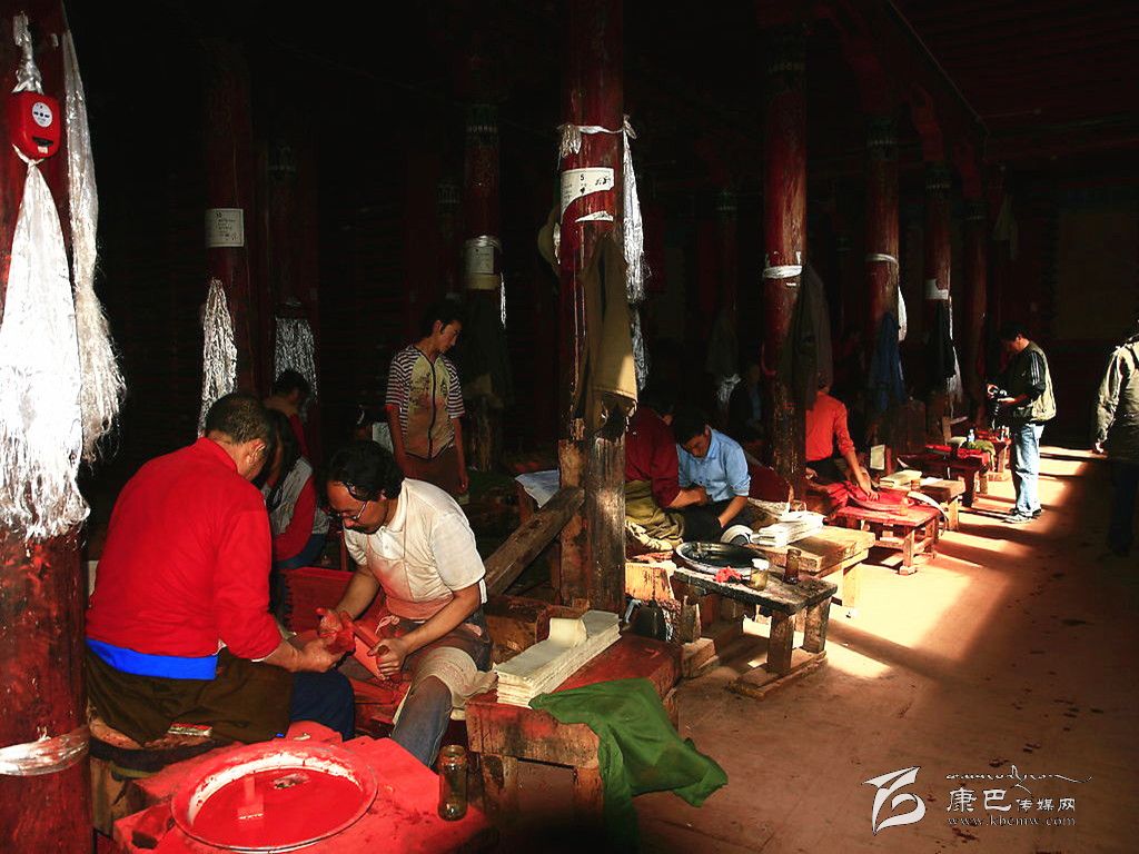 德格印經(jīng)院的各種傳統(tǒng)產(chǎn)業(yè),當(dāng)?shù)鼐用竦纳a(chǎn)勞動(dòng)都立足于當(dāng)?shù)刈匀画h(huán)境資源,并且全面地支持著傳統(tǒng)印刷技術(shù)系統(tǒng)的各階段。包括“瑞香狼毒”的草根造紙方法,均與德格地區(qū)的傳統(tǒng)產(chǎn)業(yè)有關(guān)。藏紙是當(dāng)?shù)鼐用裼脗鹘y(tǒng)手工方式制造的印刷紙,是用一種叫“阿交如交”(瑞香狼毒)草本植物根須為原料制造而成。這種紙的顏色微黃,質(zhì)地較粗厚,但纖維柔軟,不易脆,吸水性強(qiáng),同時(shí)還具有防蟲(chóng)蛀、防鼠咬,久藏不壞的特點(diǎn)。印經(jīng)院的印刷用色通常分為紅版和墨版兩種。木刻印版的刻制工作更為艱辛,印經(jīng)院選聘藏文知識(shí)高深淵博的名士將所要刻制的圖書(shū)進(jìn)行嚴(yán)格細(xì)致的三級(jí)審校,才可由聘請(qǐng)的藏文書(shū)法技藝精深的學(xué)者嚴(yán)格按照藏文書(shū)法正楷要求開(kāi)始橫版書(shū)寫(xiě)工作,他們將圖文描繪在半透明的薄紙上反貼在板面上??坦円罁?jù)紙上的色差進(jìn)行刻制,刻完后編師們?cè)谇鍢由线€要進(jìn)行三校,版面改動(dòng)較多的必須進(jìn)行重刻,一般的進(jìn)行補(bǔ)刻。直至完全準(zhǔn)確無(wú)誤時(shí)將印版放在酥油里浸泡一天后,取出曬干,再用一種名叫“蘇巴”的植物根熬水洗凈曬干,至此一塊印版的制作才算全部完成,可入庫(kù)上架和進(jìn)行印刷。通常情況下,技藝嫻熟的一名工人每天完成一張書(shū)版的單面刻制,畫(huà)版刻制工作量更大。雕刻技工都是來(lái)自本地及周邊地區(qū)的民間藝人。