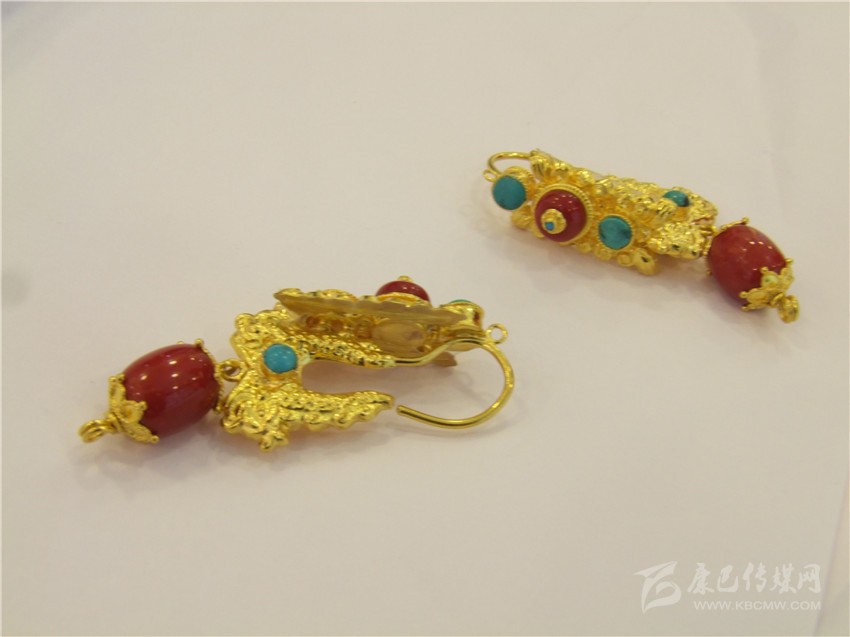 龍頭耳環(huán)在藏民族配飾歷史上較為久遠(yuǎn),設(shè)計(jì)師在遵循龍頭耳環(huán)傳統(tǒng)基礎(chǔ)上,結(jié)合當(dāng)下的潮流,用紅藍(lán)寶石做點(diǎn)綴,并在紅色寶石上打上精美的黃金花,很好的詮釋了個(gè)性與時(shí)尚的結(jié)合。