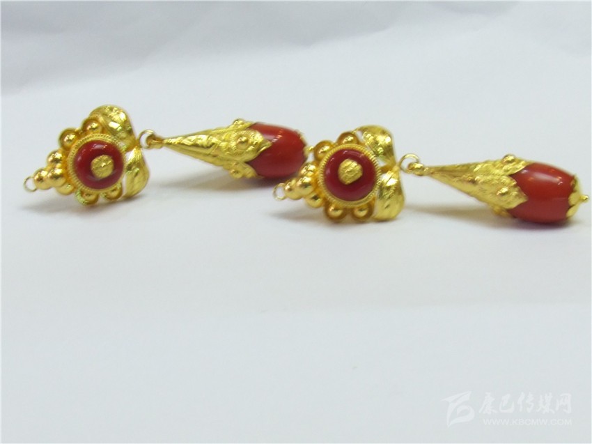 經(jīng)典的紅綠配耳環(huán)。撞色一直都是永不落伍的時(shí)尚,紅綠搭配的巧合,是藏民族熱愛生命與熱情好客的象征,用流光溢彩的金色將紅與藍(lán)包圍并連接,看起來協(xié)調(diào)而美好,搭配起來更為時(shí)尚。據(jù)店家介紹,此款耳環(huán)凈重22.75克,加上手工費(fèi),售價(jià)7000余元。