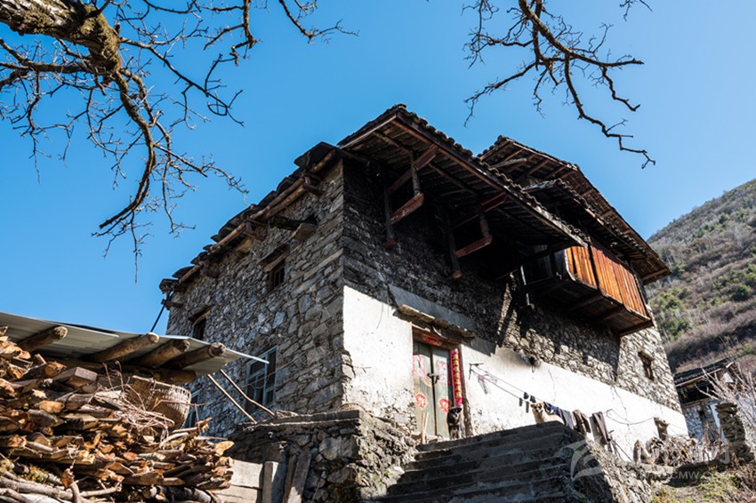 魚通人的房屋符合古人對(duì)居所背山面水的要求,多依山而建。房屋為木石混合結(jié)構(gòu),以片石木材和黃泥為主要材料建成,當(dāng)?shù)厝朔Q之為“碉房”。房屋用石塊壘起,以木頭為墻筋,每隔一定高度,橫砌進(jìn)入石塊,融為一體,使之更為堅(jiān)固牢靠?!暗锓俊?/span> 一般為三層或四層,呈四角或六角形。底層為關(guān)牲畜。第二層為“堂屋”, 在過去,是集做飯、吃飯、烤火、家人日?;顒?dòng)為一體的場(chǎng)所,地上設(shè)有火塘、灶,并在火塘上設(shè)石制三腳鍋莊或鐵三腳。第三層為各居室,有的設(shè)有貯藏室和會(huì)客屋。頂層為經(jīng)堂,室外為曬壩,作打場(chǎng)、曬場(chǎng)用。有些在外側(cè)設(shè)有一小吊腳樓,可堆放雜物。隨著時(shí)間的流逝,古老的碉房已無法滿足現(xiàn)在居民的需求,已很少有人居住,而新式碉房在傳統(tǒng)的基礎(chǔ)上開始出現(xiàn)。