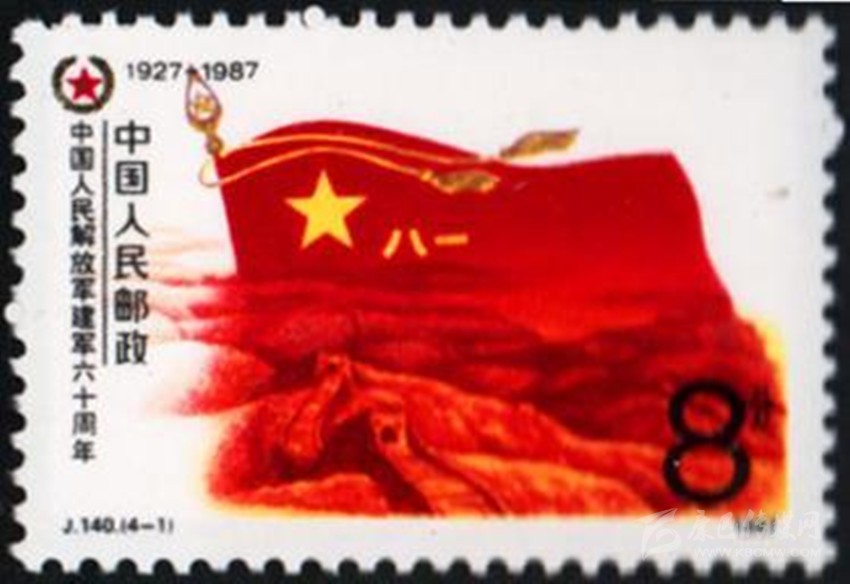 1977年8月1日原郵電部發(fā)行的《中國人民解放軍建軍50周年》紀(jì)念郵票,其中第4枚“雄師過大江”,圖案中一名沖在渡江隊(duì)伍前面的戰(zhàn)士高舉一面“八一”軍旗。1987年8月1日原郵電部發(fā)行的《中國人民解放軍建軍60周年》紀(jì)念郵票一套4枚。其中第1枚“軍魂”,郵票上一面鮮紅的“八一”軍旗迎風(fēng)飄揚(yáng),旗下是蜿蜒的萬里長城,代表了中國人民解放軍是保衛(wèi)祖國和人民的“鋼鐵長城”。1995年8月1日,原郵電部試發(fā)行一套“義務(wù)兵專用”郵票一套1枚,票名為“神圣的使命”,圖案以紅光四射的“八一”軍旗為背景,以現(xiàn)代化的飛機(jī)、坦克、火箭和象征和平的白鴿為襯托,畫面是威武的陸??杖?,顯示我軍鋼鐵長城般攻無不克、戰(zhàn)無不勝的精神風(fēng)貌。