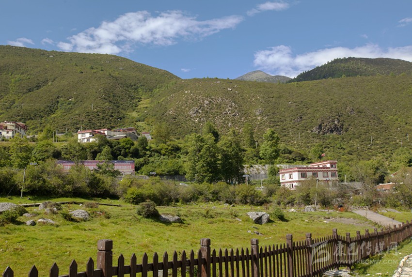 折多塘村房舍現(xiàn)多數(shù)沿公路兩側(cè)筑建。其實(shí)沒通公路前,山間馱道應(yīng)是村后呈椅狀的一片草坡上。草坡邊自古就有的一方露天溫泉池塘水霧彌漫,熱氣蒸騰,正應(yīng)了前人所記“山凹有熱泉沸起”、“憇啞池塘,帳宿于折多”;且在舊時馭馬馱牛的行旅中宿棧,這寬大的草坪方適合繃搭帳蓬和放牧牲畜,露天溫泉又可洗濯行旅之勞頓。