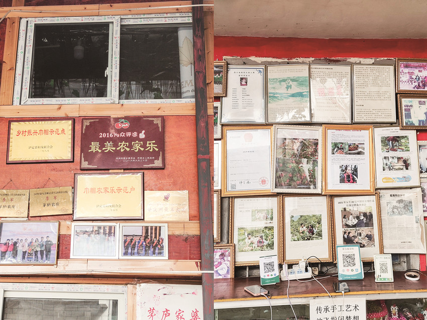 她說:“一開始,我的目的就是想掙錢,想要這個家庭擺脫貧困。在開辦這個農(nóng)莊之前,我家一直就在借債還債的循環(huán)中苦苦掙扎。天有不測風(fēng)云,2006年丈夫華建做心臟手術(shù),2007年又做膽息肉手術(shù),花光了四處借來的四萬多塊錢,丈夫出院回家后,不能外出打工,又要急著還人家的錢,在無計(jì)可施的時候,我們想到了搞養(yǎng)殖,養(yǎng)魚魚死光了,養(yǎng)雞倒是成功了,但是賣不出去,基本虧了個底朝天。我只好四處打工,但是基本上都處于入不敷出的尷尬境地?!?013年長子華啟明住院做脾裂手術(shù),2015年公公腦梗,又去州醫(yī)院手術(shù),好像前半輩子就是借錢、還錢,拆東墻補(bǔ)西墻,無可奈何。正當(dāng)經(jīng)濟(jì)上緊張得不可開交,覺得山窮水盡時,國家出臺了鄉(xiāng)村振興戰(zhàn)略,她響應(yīng)國家號召,想到了回到家鄉(xiāng)開辦農(nóng)家樂。第一年,在“婦女創(chuàng)業(yè)”貸款8萬元、信用社貸款16萬元,把農(nóng)家樂勉強(qiáng)辦起來了。在幾年的經(jīng)營中,“茅廬農(nóng)莊”的口碑越來越好,在2016年被杵坭鄉(xiāng)授予“2016大眾評選最美農(nóng)家樂”,在2018年人氣美食商家網(wǎng)評選為“瀘定縣網(wǎng)友喜愛美食商家評選季軍”,2019年人氣生態(tài)評選網(wǎng)評選為“瀘定縣網(wǎng)友喜愛生態(tài)休閑農(nóng)莊評選季軍”?,F(xiàn)在,農(nóng)莊的生意越來越好,規(guī)模越來越大,家里的日子越來越好,一家人也過上了幸福的生活。