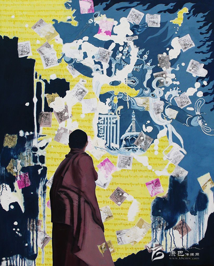 采用藏區(qū)題材做藝術的藝術家不在少數(shù),強調寫實、原汁原味是大部分藝術家的選擇,但生于康定的藝術家周韜卻有另一番更深入的認識。與美國印第安藝術家Brad kahlhamer一樣,他用更加強烈動態(tài)的視覺制造了一個魔幻世界,讓眾人熟悉的藏區(qū)元素在畫面上集中而豐富地跳躍起來,比如喇嘛、活佛、長辮子的藏族女人,甚至形狀怪異的骷髏!