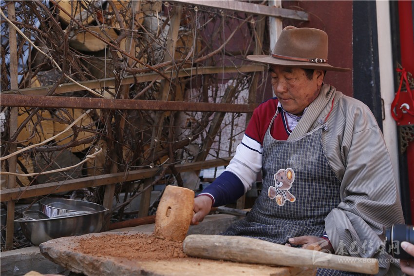 四龍降澤將一塊塊雌雄泥放在平坦的石頭上,用木錘敲打,泥土被打散后,用石頭研磨,再通過木篩濾出最細(xì)的泥土備用,接著把以紅景天為主的60多種中草藥、香果為主的20多種香藥和60多種藏藥以及珊瑚、綠松石、瑪瑙等組成的80多種寶石和80多種宗教圣物稱量,按照一定的比例與泥土混合,繼續(xù)將藥物與泥土搗碎、研磨直至混為一體,然后把取自海拔4600米以上無污染的水將泥土、藥物和在一起,然后用類似搟面杖的木棒捶打并揉成面團(tuán),放入地窖發(fā)酵7天直至香味溢出。