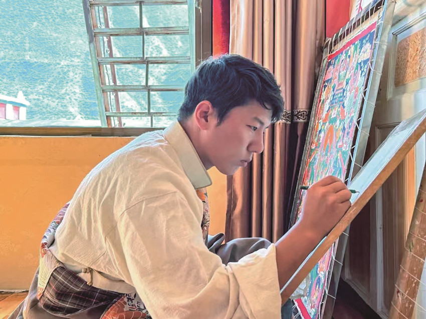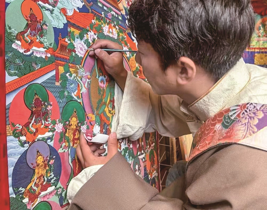 “唐卡作為中國(guó)民族繪畫(huà)藝術(shù)的珍品,不僅呈現(xiàn)精湛的技藝和美學(xué),更是傳遞一種文化?!睏畹潜硎?,他作為一名縣級(jí)非遺傳承人,要在繼承傳統(tǒng)技藝的基礎(chǔ)上,采用多元藝術(shù)技藝賦予傳統(tǒng)唐卡更多創(chuàng)意,讓民族文化瑰寶能夠更好地發(fā)揚(yáng)光大。
