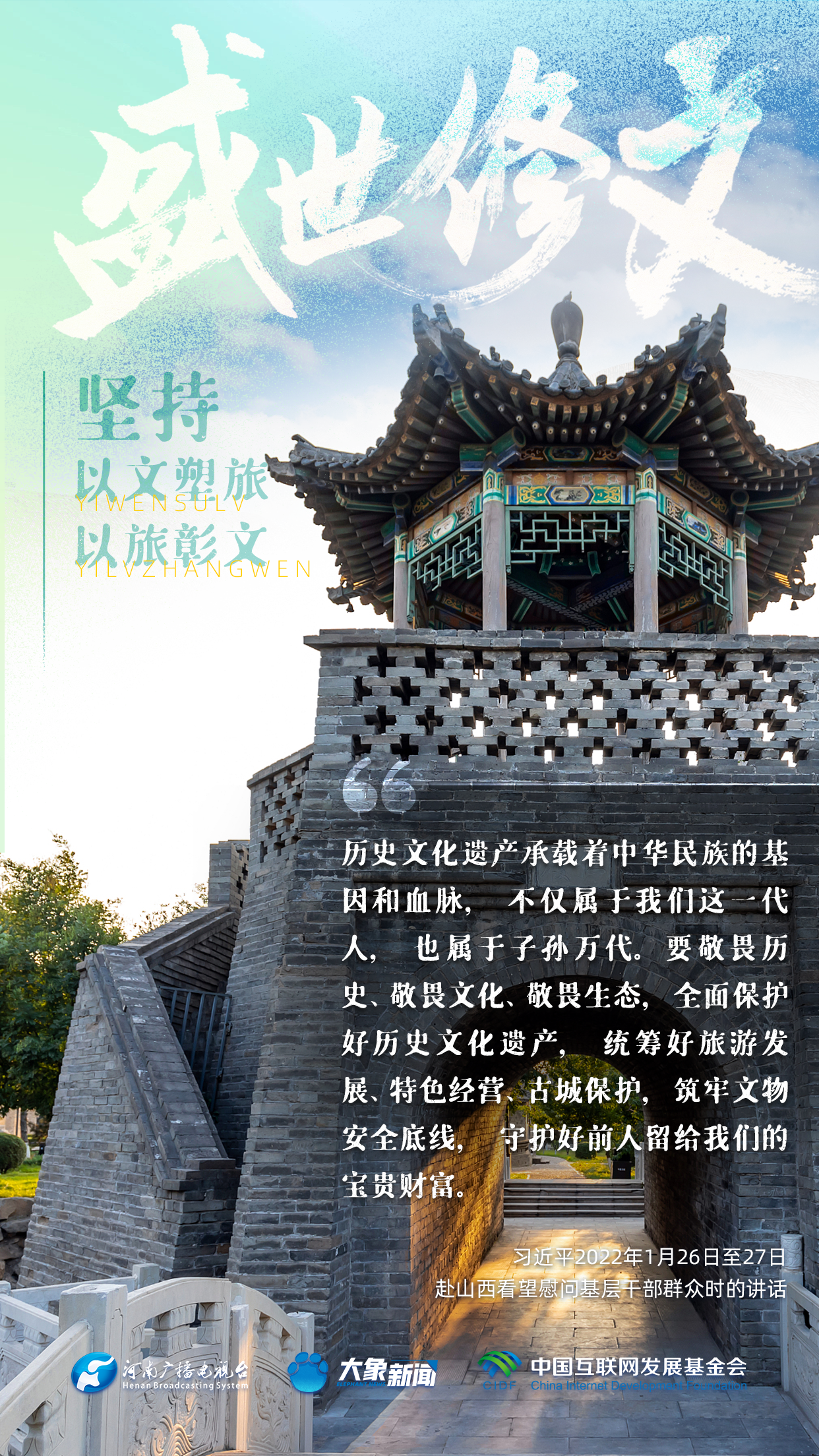 今天推出:習(xí)近平文化思想金句之《盛世修文|堅(jiān)持以文塑旅、以旅彰文》
