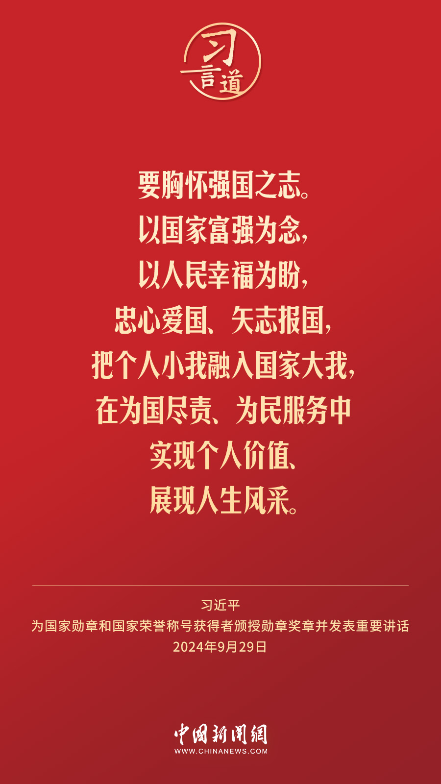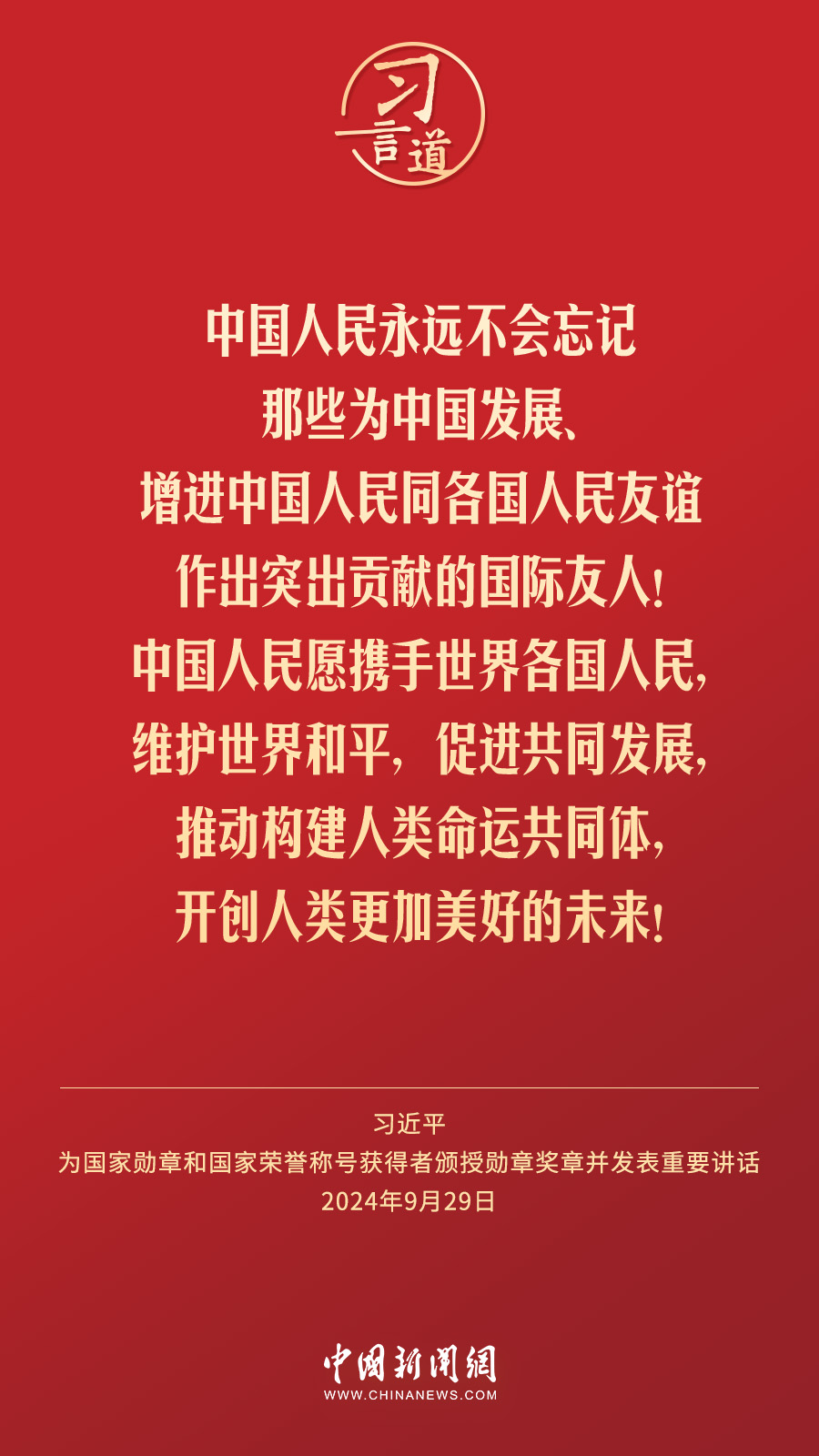 經(jīng)中共中央批準(zhǔn),中華人民共和國(guó)國(guó)家勛章和國(guó)家榮譽(yù)稱號(hào)頒授儀式于9月29日上午10時(shí)在人民大會(huì)堂隆重舉行。中共中央總書記、國(guó)家主席、中央軍委主席習(xí)近平向國(guó)家勛章和國(guó)家榮譽(yù)稱號(hào)獲得者分別授予“共和國(guó)勛章”“友誼勛章”和國(guó)家榮譽(yù)稱號(hào)獎(jiǎng)?wù)虏l(fā)表重要講話。習(xí)近平指出——