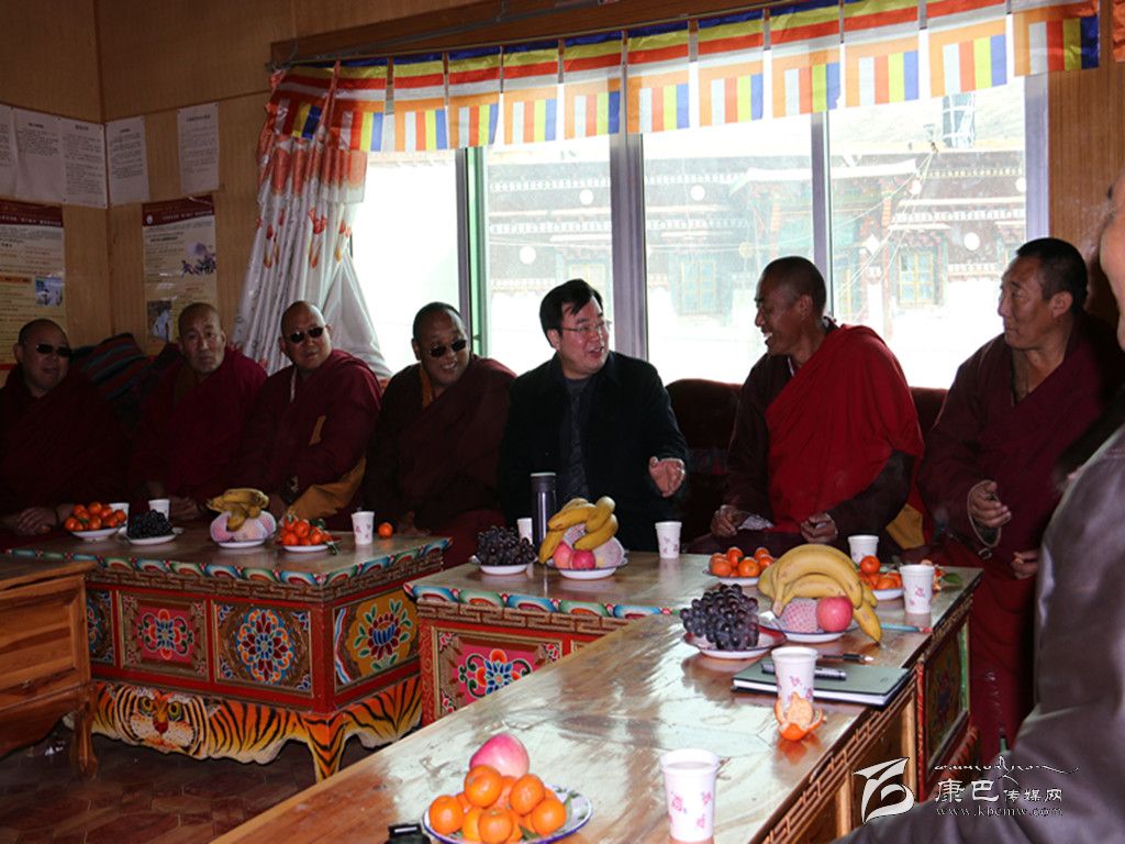 到達爐霍縣城已是中午兩點,僅用十分鐘時間吃過午飯,胡昌升又立即趕往爐霍縣壽靈寺,看望同心同向活動中結下深厚友誼的“老朋友”。每次到壽靈寺,胡昌升與寺管會成員都有說不完的話,有聊不完的開心事,新年就要到來,大家你一言我一語祝福2015。英巴澤仁說,希望今年“五二三”學教活動能開展得更好。澤仁扎西說,黨的十八大提出的24字社會主義核心價值觀,字字說在我們的心里,只要把這24字落到實處,偉大中國夢就一定會實現。聽完大家的發(fā)言,胡昌升十分高興,他說,希望2015年全州平安和諧、和和氣氣、和和美美、和和睦睦。