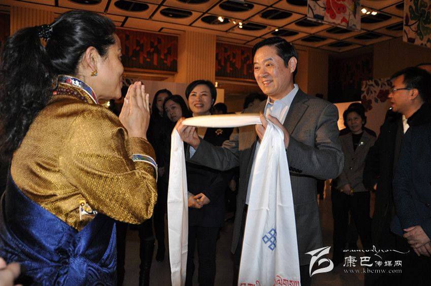 穆黎代表甘孜州婦聯(lián)向劉奇葆獻(xiàn)上藏繡哈達(dá)。