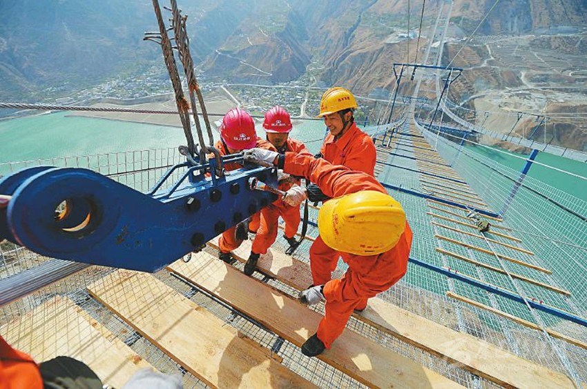 經過2小時的牽引施工,4月5日,雅康高速公路重點控制性工程、被稱為“川藏第一橋”的瀘定大渡河興康特大橋首根主纜索股成功架設,跨越大渡河“鎖定”在康定、雅安境內的錨碇上。特大橋上部構架主體工程施工由此正式啟動,甘孜藏區(qū)迎來首條高速大通道指日可待。