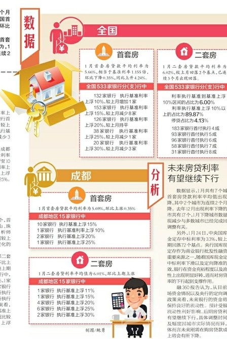 其中,上海首套房貸利率較上月持平仍為最低,成都首套房貸利率平均值為5.69%,環(huán)比上漲0.35%。分析師認(rèn)為,1月利率下調(diào)銀行數(shù)量較上月減少,首套平均利率出現(xiàn)連續(xù)2個月下降,未來利率整體繼續(xù)回落的可能性較大。