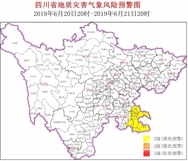 四川在線消息(記者 寇敏芳)6月20日,省自然資源廳發(fā)布全省地災(zāi)氣象風(fēng)險(xiǎn)預(yù)警。結(jié)合四川省氣象臺(tái)天氣預(yù)報(bào)情況,6月20日20時(shí)~6月21日20時(shí),全省地質(zhì)災(zāi)害氣象風(fēng)險(xiǎn)預(yù)警等級(jí)為3級(jí)(黃色預(yù)警,注意級(jí)),具體結(jié)果如下: