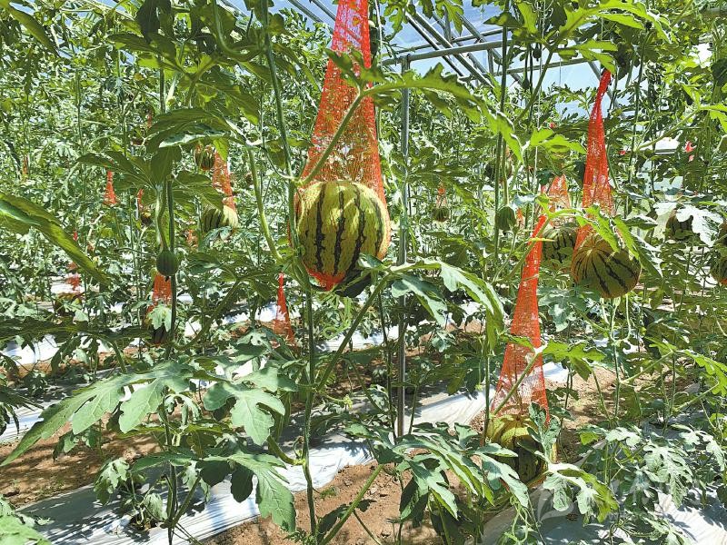 旭日鄉(xiāng)現(xiàn)代農(nóng)業(yè)示范基地的西瓜大棚里果實累累。