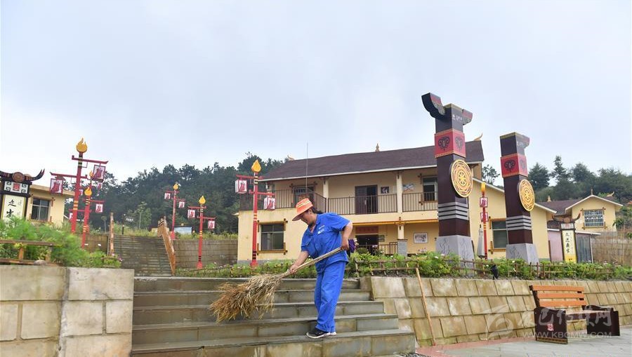 9月7日,一名在景區(qū)工作的彝海村村民在清掃小廣場(chǎng)。