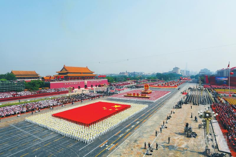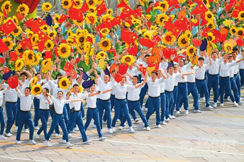 金秋時(shí)節(jié)的北京,張燈結(jié)彩,繁花似錦,處處洋溢著節(jié)日的喜慶氣氛。從天安門廣場(chǎng)到金水橋南端,大型“紅飄帶”主題景觀、7棵特效光影“煙花樹”、LED巨幅網(wǎng)幕、3000多名手持“光影屏”的聯(lián)歡群眾以及各族各界群眾,將聯(lián)歡活動(dòng)核心區(qū)域裝扮得流光溢彩、絢麗奪目。10個(gè)群眾聯(lián)歡區(qū)分布長(zhǎng)安街沿線,數(shù)萬群眾以歡歌熱舞,點(diǎn)贊共和國、謳歌新時(shí)代。