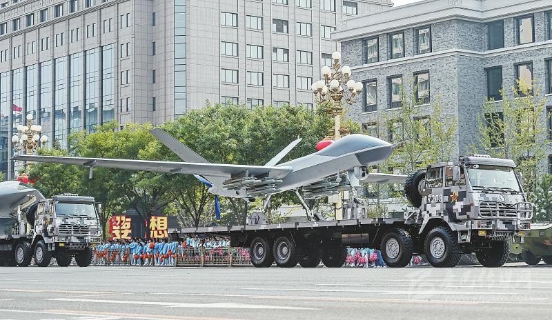 在兩輛指揮引導(dǎo)車帶領(lǐng)下,由攻擊-2無(wú)人機(jī)、攻擊-11無(wú)人機(jī)和反輻射無(wú)人機(jī)組成的無(wú)人作戰(zhàn)第2方隊(duì)通過(guò)天安門(mén),向世界展示了中國(guó)無(wú)人作戰(zhàn)平臺(tái)的又一嶄新成就。