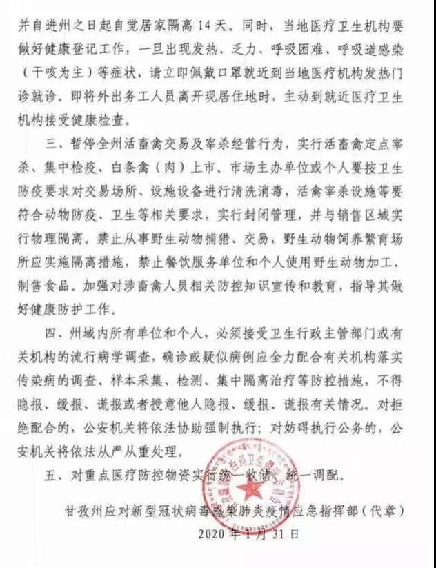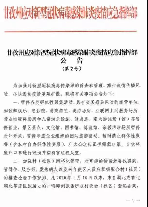 一、暫停各類群體性聚集活動。具有交叉感染風(fēng)險的經(jīng)營單位,如歌舞娛樂、電影院、游戲游藝、洗浴場所、互聯(lián)網(wǎng)上網(wǎng)服務(wù)場所、營業(yè)性麻將場所和兒童游樂設(shè)施、健身房、室內(nèi)游泳場(館)等暫停營業(yè),景區(qū)景點、文化館、圖書館、博覽館、宗教活動場所暫停對外開放,暫停涉旅企業(yè)組織的團隊旅游活動。暫時禁止群體性聚餐(含農(nóng)村自辦群體性宴席)。廣大公眾應(yīng)正確佩戴口罩,自覺將廢棄口罩進行毀損并按有害垃圾處置。二、加強村(社區(qū))網(wǎng)格化管理,對可能的傳染源要找得到、管得住、服務(wù)好。發(fā)熱病人以及來自疫區(qū)人員應(yīng)積極配合村(社區(qū))的排查檢疫工作安排。凡2020年1月10日以來,來自湖北或有過湖北等疫區(qū)旅居史的,請即刻報告所在村委會(社區(qū))登記備案,并自進州之日起自覺居家隔離14天。同時,當(dāng)?shù)蒯t(yī)療衛(wèi)生機構(gòu)要做好健康登記工作,一旦出現(xiàn)發(fā)熱、乏力、呼吸困難、呼吸道感染(干咳為主)等癥狀,請立即佩戴口罩就近到當(dāng)?shù)蒯t(yī)療機構(gòu)發(fā)熱門診就診。即將外出務(wù)工人員離開現(xiàn)居住地時,主動到就近醫(yī)療衛(wèi)生機構(gòu)接受健康檢查。三、暫停全州活畜禽交易及宰殺經(jīng)營行為,實行活畜禽定點宰殺、集中檢疫、白條禽(肉)上市。市場主辦單位或個人要按衛(wèi)生防疫要求對交易場所、設(shè)施設(shè)備進行清洗消毒,活禽宰殺設(shè)施等要符合動物防疫、衛(wèi)生等相關(guān)要求,實行封閉管理,并與銷售區(qū)域?qū)嵭形锢砀綦x。禁止從事野生動物捕獵、交易,野生動物飼養(yǎng)繁育場所應(yīng)實施隔離措施,禁止餐飲服務(wù)單位和個人使用野生動物加工、制售食品。加強對涉畜禽人員相關(guān)防控知識宣傳和教育,指導(dǎo)其做好健康防護工作。四、州域內(nèi)所有單位和個人,必須接受衛(wèi)生行政主管部門或有關(guān)機構(gòu)的流行病學(xué)調(diào)查,確診或疑似病例應(yīng)全力配合有關(guān)機構(gòu)落實傳染病的調(diào)查、樣本采集、檢測、集中隔離治療等防控措施,不得隱報、緩報、謊報或者授意他人隱報、緩報、謊報有關(guān)情況。對拒絕配合的,公安機關(guān)將依法協(xié)助強制執(zhí)行;對妨礙執(zhí)行公務(wù)的,公安機關(guān)將依法從嚴(yán)從重處理。五、對重點醫(yī)療防控物資實行統(tǒng)一收儲、統(tǒng)一調(diào)配。甘孜州應(yīng)對新型冠狀病毒感染肺炎疫情應(yīng)急指揮部