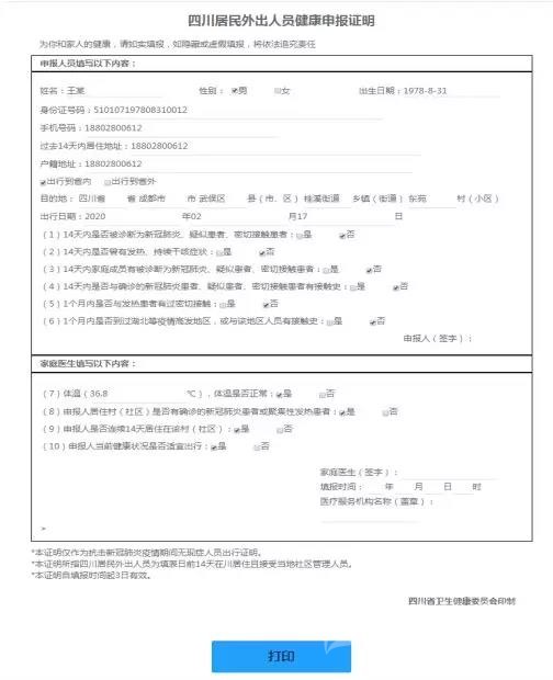 (二)服務(wù)內(nèi)容。居住地醫(yī)療衛(wèi)生機構(gòu)對申報人在開展流行病學史調(diào)查、測量體溫的基礎(chǔ)上,為符合條件的申報人出具《四川外出人員健康申報證明》。