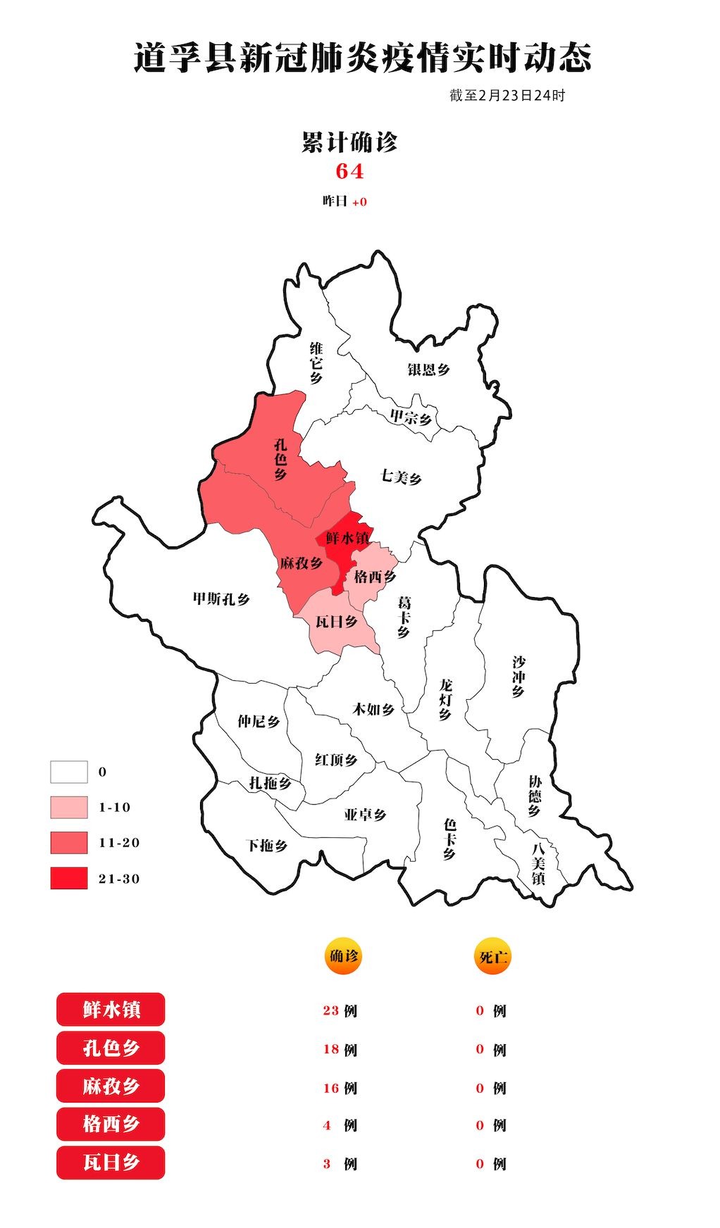 截止2月23日24時,我州累計報告新型冠狀病毒肺炎確診病例69例(道孚64例、康定2例、色達2例、稻城1例),其中治愈出院12例,在治重癥5例,危重癥1例,其余患者病情穩(wěn)定,均在定點醫(yī)院接受治療。其中,男性39例,女性30例,最大的77歲,最小的3歲。