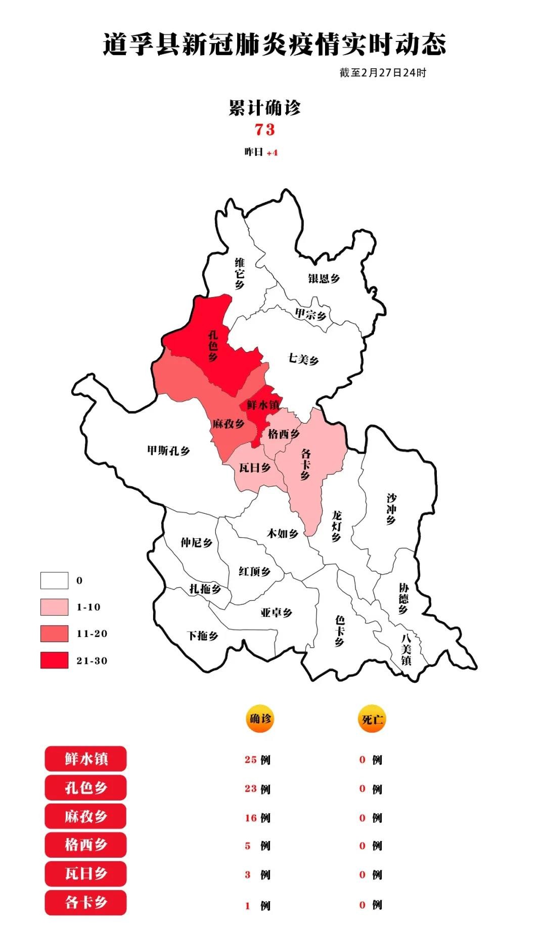 截至2月27日24時,甘孜州累計確診新冠肺炎病例78例,共治愈出院20名(其中道孚縣患者15名)。道孚縣確診患者均集中在麻孜鄉(xiāng)、孔色鄉(xiāng)、格西鄉(xiāng)、各卡鄉(xiāng)、瓦日鄉(xiāng)、鮮水鎮(zhèn)“五鄉(xiāng)一鎮(zhèn)”。在已納入管控的確診病例、疑似病例以及正接受醫(yī)學(xué)觀察的密切接觸者之外,暫未發(fā)現(xiàn)新疫情。
