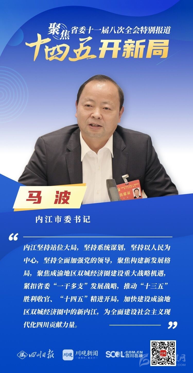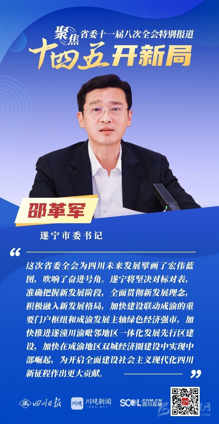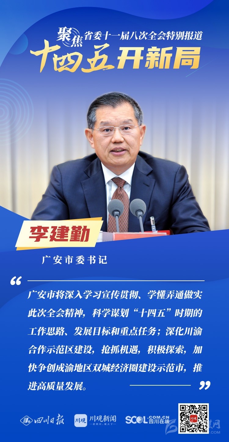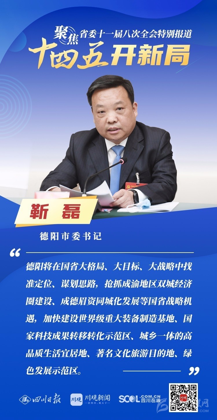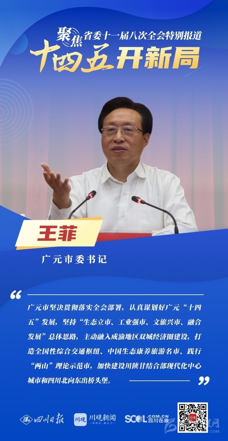 12月3日,中共四川省委十一屆八次全會(huì)在成都開(kāi)幕,全會(huì)將深入學(xué)習(xí)貫徹黨的十九屆五中全會(huì)精神,審議《中共四川省委關(guān)于制定四川省國(guó)民經(jīng)濟(jì)和社會(huì)發(fā)展第十四個(gè)五年規(guī)劃和二〇三五年遠(yuǎn)景目標(biāo)的建議(討論稿)》,為未來(lái)5年乃至更長(zhǎng)時(shí)期四川發(fā)展謀劃新藍(lán)圖 。