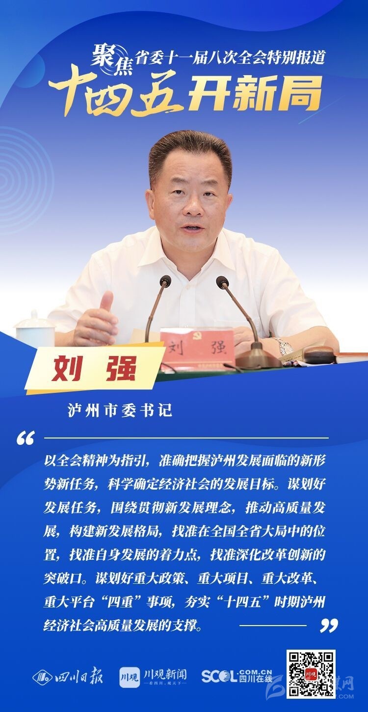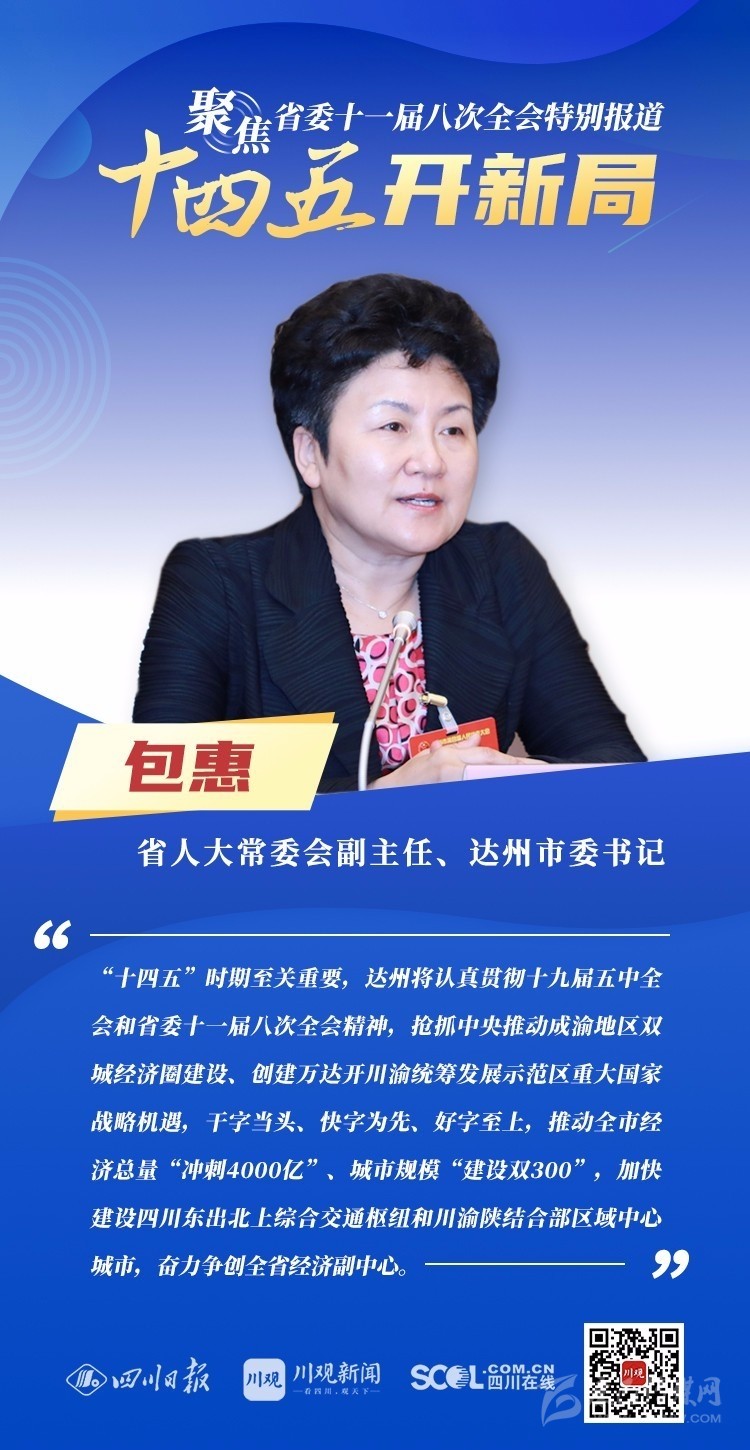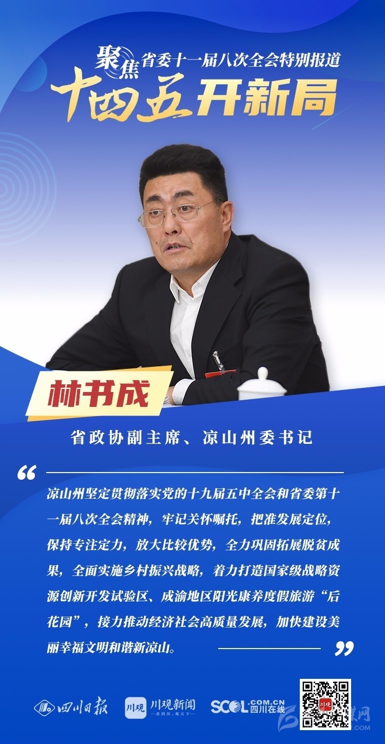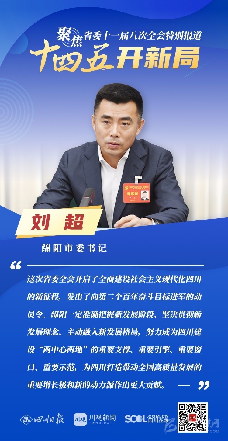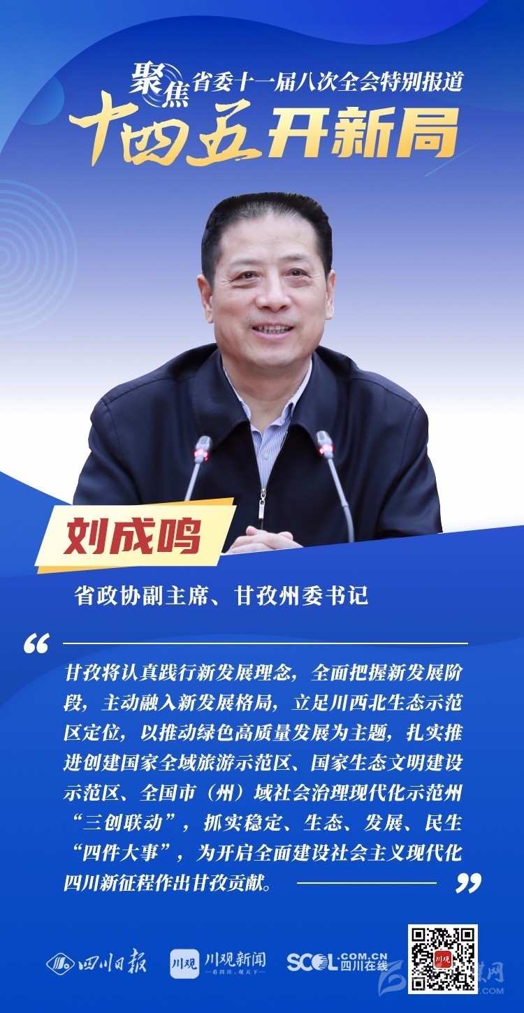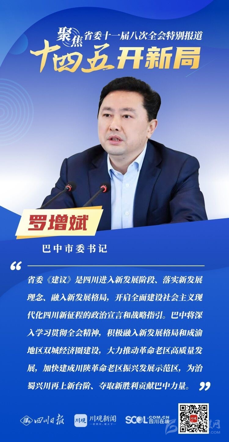 12月3日,中共四川省委十一屆八次全會(huì)在成都開(kāi)幕,全會(huì)將深入學(xué)習(xí)貫徹黨的十九屆五中全會(huì)精神,審議《中共四川省委關(guān)于制定四川省國(guó)民經(jīng)濟(jì)和社會(huì)發(fā)展第十四個(gè)五年規(guī)劃和二〇三五年遠(yuǎn)景目標(biāo)的建議(討論稿)》,為未來(lái)5年乃至更長(zhǎng)時(shí)期四川發(fā)展謀劃新藍(lán)圖 。
