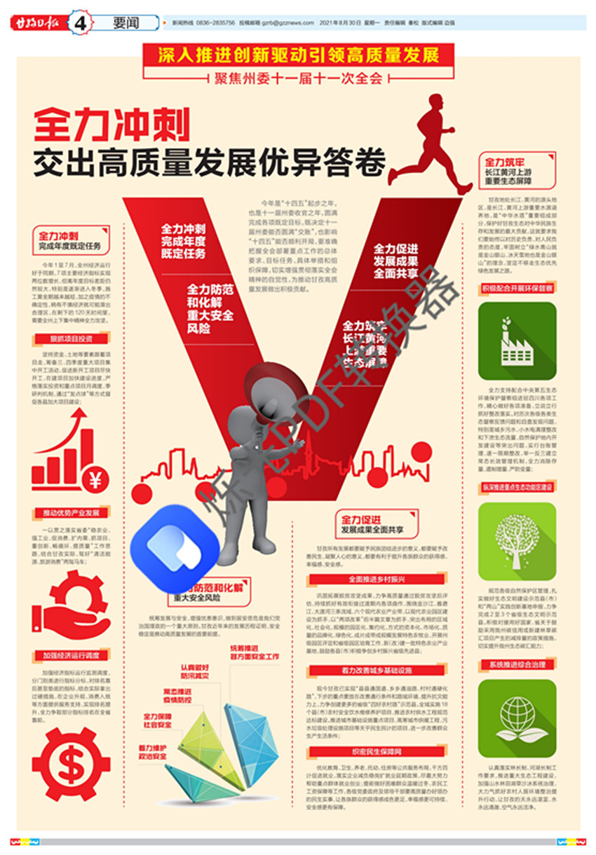 全會(huì)提出了深入推進(jìn)創(chuàng)新驅(qū)動(dòng)引領(lǐng)高質(zhì)量發(fā)展的目標(biāo)任務(wù),這就是:經(jīng)過(guò)“十四五”時(shí)期努力,形成川西北生態(tài)示范區(qū)綠色發(fā)展科技支撐體系。綜合創(chuàng)新能力明顯提升,形成一批有份量的科技成果和示范應(yīng)用成果。高原特色產(chǎn)業(yè)科技含量普遍提高,信息化與一、二、三產(chǎn)業(yè)的融合發(fā)展成效明顯。生態(tài)保護(hù)和建設(shè)步伐加快,綠色低碳循環(huán)發(fā)展體系基本形成,長(zhǎng)江、黃河上游重要生態(tài)屏障進(jìn)一步筑牢。數(shù)字甘孜建設(shè)成效顯著,信息化基礎(chǔ)逐步夯實(shí),信息應(yīng)用大幅提升。民生領(lǐng)域科技創(chuàng)新應(yīng)用進(jìn)一步推廣,教育、衛(wèi)生、社會(huì)保障等公共服務(wù)能力和水平不斷提高。社會(huì)治理創(chuàng)新能力進(jìn)一步提升,社會(huì)治理現(xiàn)代化水平不斷提高。創(chuàng)新主體發(fā)展壯大,創(chuàng)新創(chuàng)業(yè)能力大幅提升。創(chuàng)新環(huán)境明顯優(yōu)化,創(chuàng)新要素保障有力。