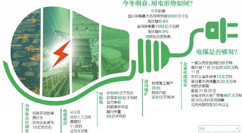 截至11月28日,全省主網(wǎng)火電廠存煤497.5萬噸,按95%開機(jī)負(fù)荷測(cè)算,可用天數(shù)均在20天以上。同時(shí),國網(wǎng)四川省電力公司全力落實(shí)外購電量和留川電量,外購電計(jì)劃80億千瓦時(shí)已落實(shí)60億千瓦時(shí),全力爭取白鶴灘水電站留川電量65億千瓦時(shí)。