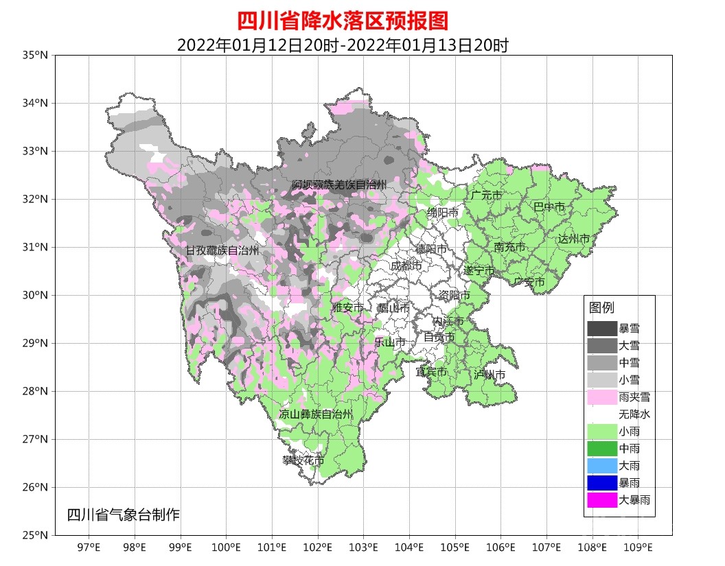 預(yù)計(jì)12日晚上到13日白天,盆地各市陰天,部分地方有小雨或零星小雨,西部北部高海拔地區(qū)有雨夾雪;川西高原和攀西地區(qū)陰天間多云有陣雪(雨),局部地方有中到大雪。