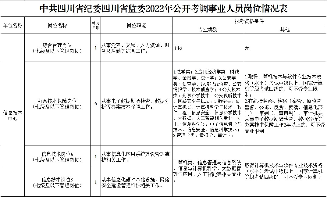 符合報(bào)考崗位規(guī)定的資格條件,詳見(jiàn)《中共四川省紀(jì)委四川省監(jiān)委2022年公開(kāi)考調(diào)事業(yè)人員崗位情況表》(附后)。