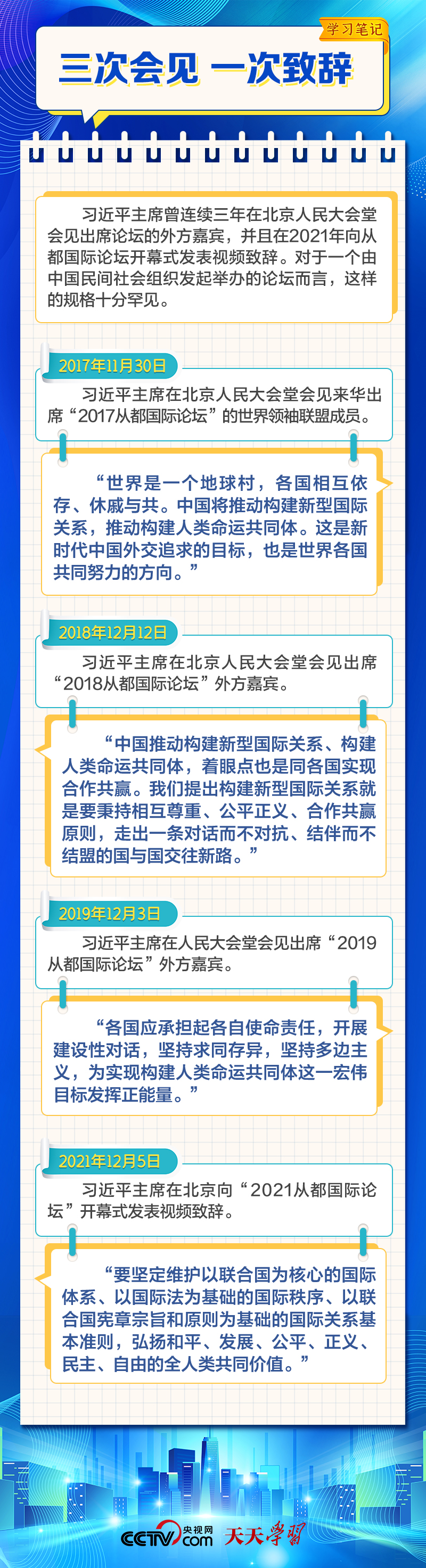天天學(xué)習(xí)12月4日,習(xí)近平主席在致“2023從都國際論壇”的賀信中強(qiáng)調(diào),面對前所未有的世界之變、時(shí)代之變和歷史之變,人類社會必須團(tuán)結(jié)起來,堅(jiān)持互學(xué)互鑒、開放包容、合作共贏,弘揚(yáng)全人類共同價(jià)值,共同建設(shè)更加美好的世界。