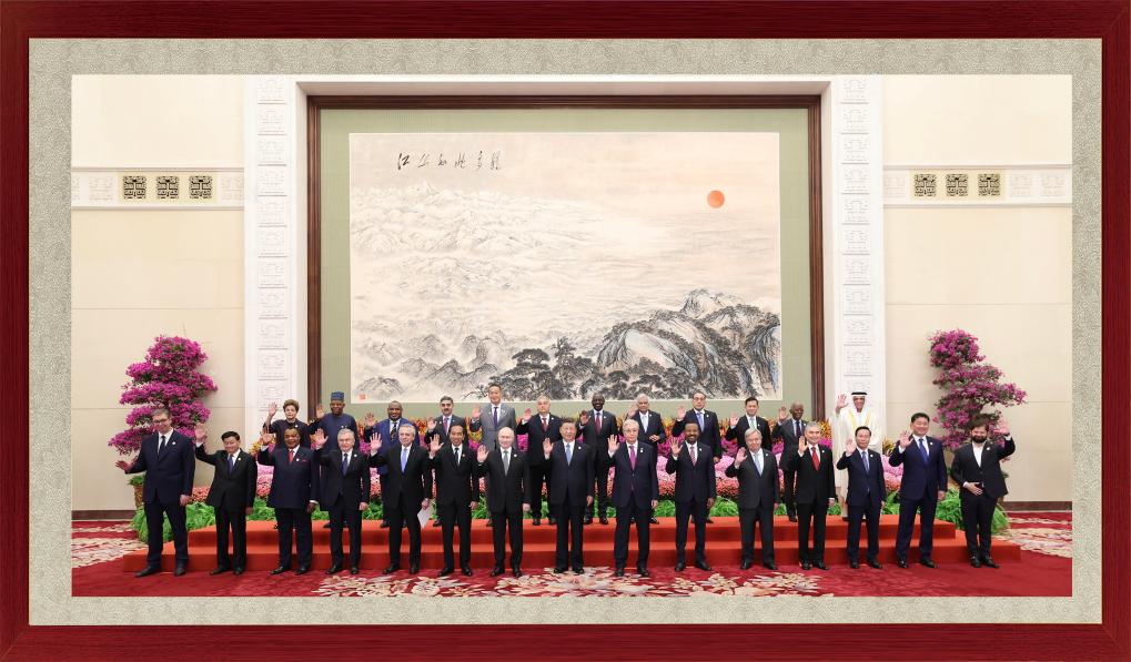 人民大會堂,巨幅國畫《江山如此多嬌》前,習近平主席同出席第三屆“一帶一路”國際合作高峰論壇的外國國家元首、政府首腦和國際組織負責人等國際貴賓集體合影。