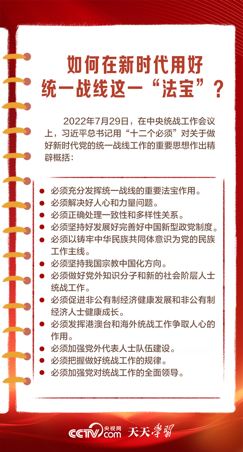 天天學(xué)習(xí)1月16日出版的第2期《求是》雜志發(fā)表了習(xí)近平總書記的重要文章《完整、準(zhǔn)確、全面貫徹落實(shí)關(guān)于做好新時(shí)代黨的統(tǒng)一戰(zhàn)線工作的重要思想》,該文是習(xí)近平總書記2022年7月在中央統(tǒng)戰(zhàn)工作會(huì)議上講話的一部分。文章指出,統(tǒng)一戰(zhàn)線是黨克敵制勝、執(zhí)政興國的重要法寶,是團(tuán)結(jié)海內(nèi)外全體中華兒女實(shí)現(xiàn)中華民族偉大復(fù)興的重要法寶,必須長期堅(jiān)持。