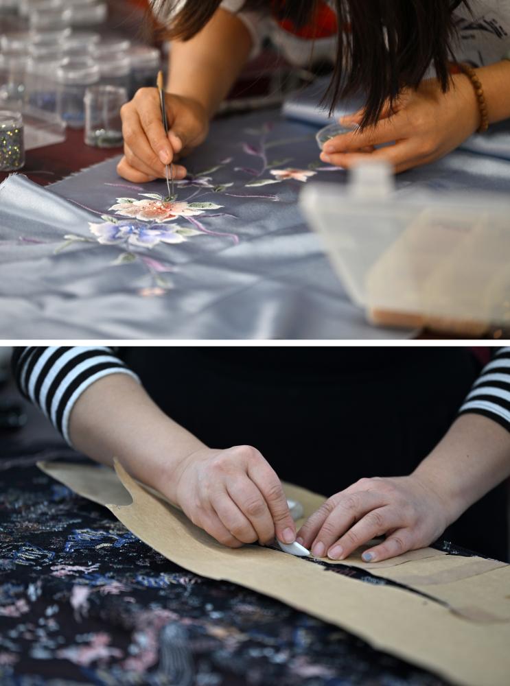 ??拼版照片:上圖為老美華定制車間的制衣師傅在面料上貼鉆;下圖為老美華定制車間的制衣師傅在面料上劃線(2023年12月8日攝)。天津老美華始創(chuàng)于1911年,歷史上以“千層底”布鞋聞名,是享譽(yù)津門的“中華老字號”。新華社記者 李然 攝