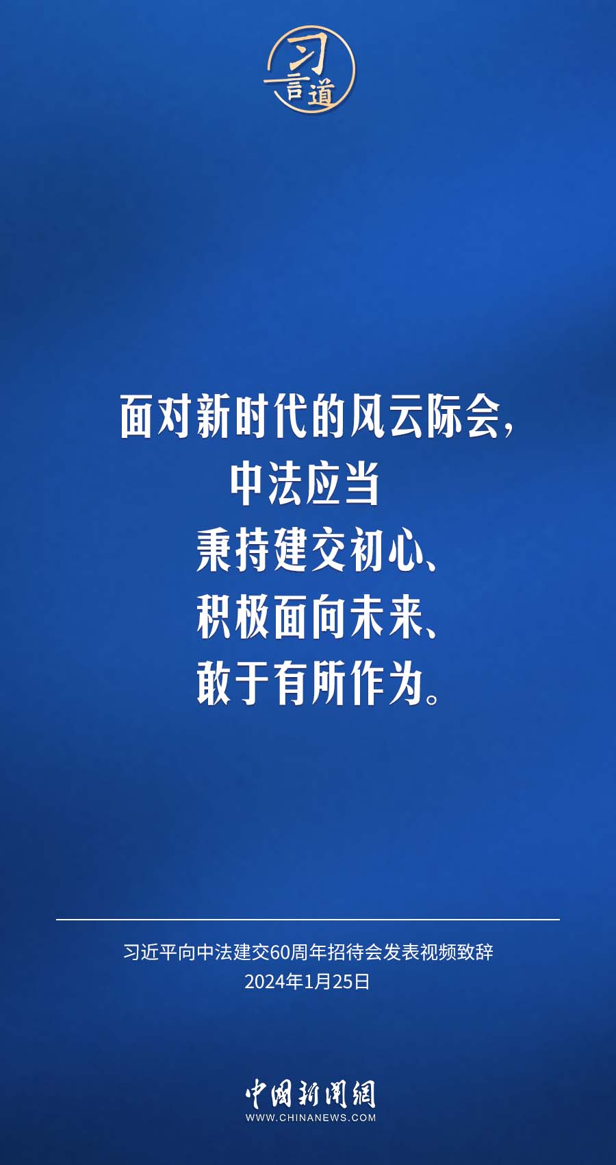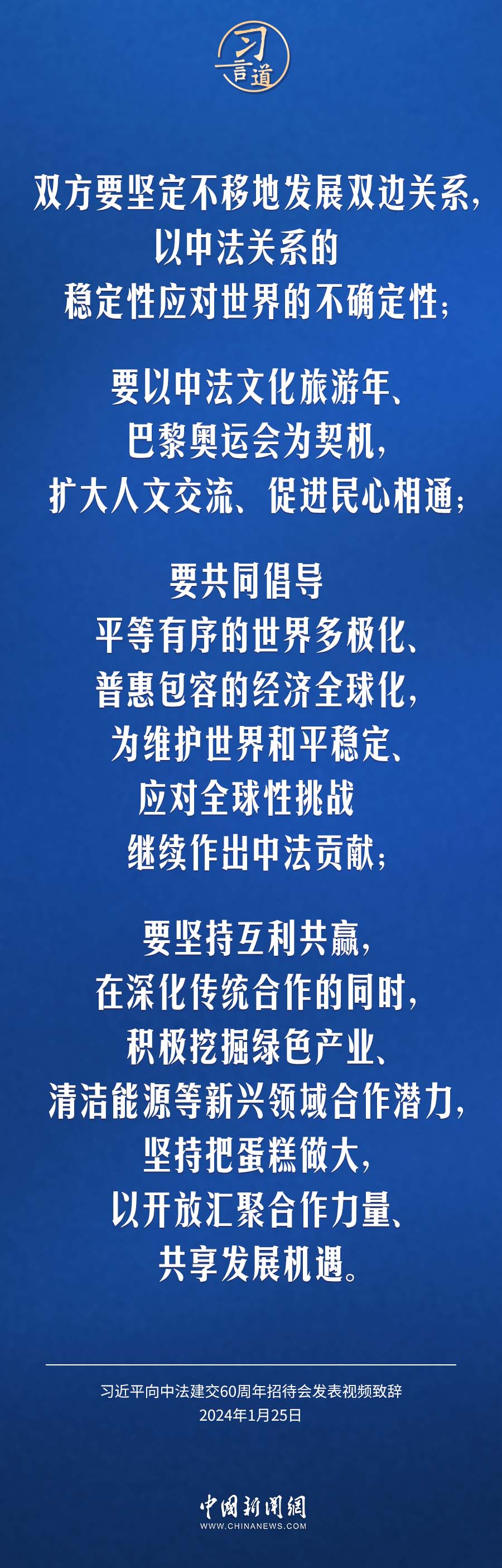 1月25日,中法建交60周年招待會(huì)在國(guó)家大劇院舉行,國(guó)家主席習(xí)近平發(fā)表視頻致辭。習(xí)近平指出——